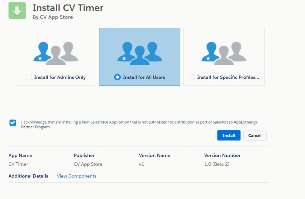 4. Once you are presented with the installation screen, you are required to select which of your users should be granted access to the CV Timer app including all its components.