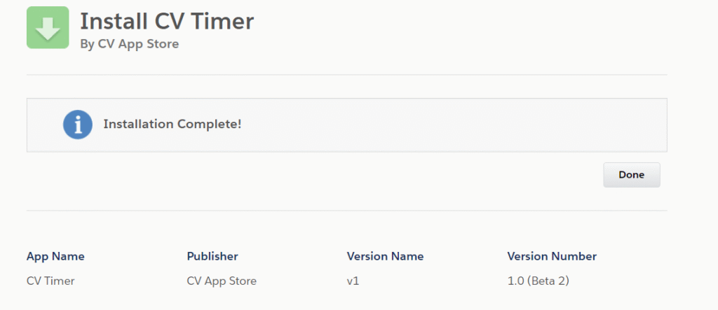 Once the installation is complete, click the Done button to return to your Salesforce org. You may see a message stating that the installation is taking a long time to complete. In this case, you will receive an email once the installation finishes.