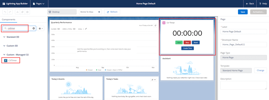 Drag and Drop the CVTimer component on your page layout at the desired section. Click Save.