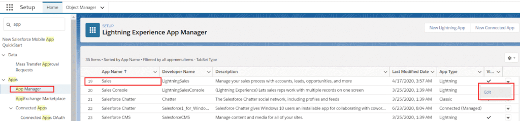 From Setup, enter App in the Quick Find box, then select App Manager. To edit or add a utility bar to an existing app, click Edit in the dropdown menu next to your app.
