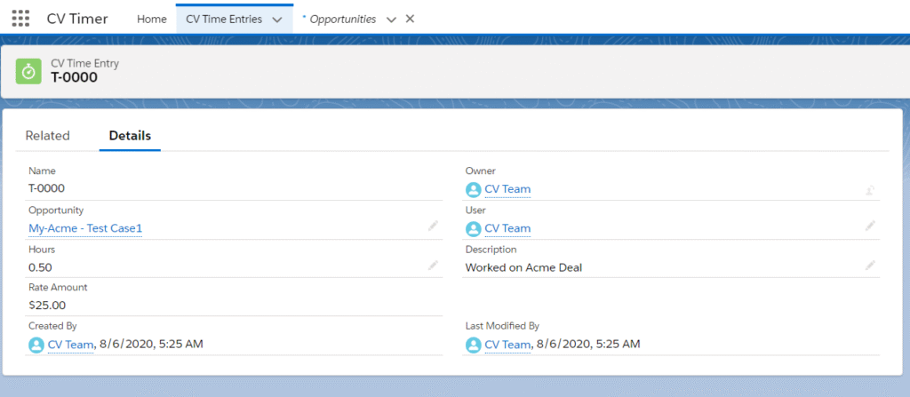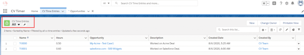 You can also access the time logged from the Opportunity Record. Go to any Opportunity record and scroll for the CV Time Entries related list to view all the CV Time Entries for that opportunity.