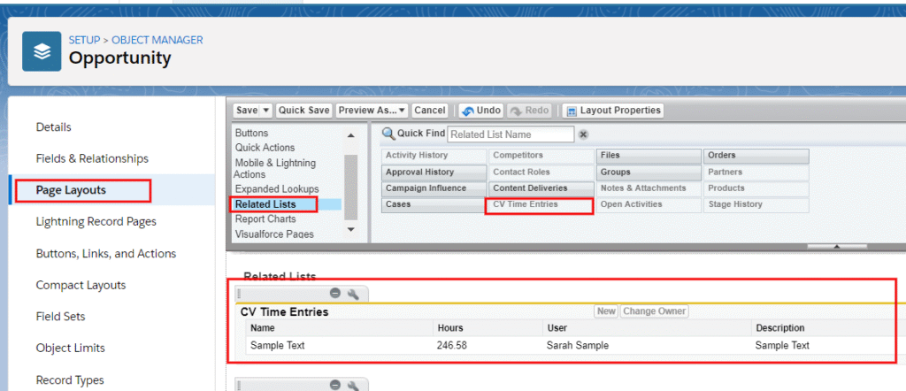 From the Related Lists tab, Drag and Drop CV Time Entries in the Related Lists Section.
