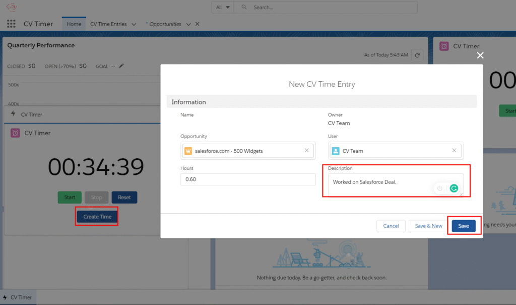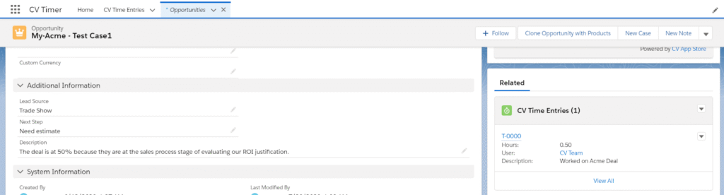 CV Timer app is smart enough to capture opportunity detail automatically if you Create Time from any Opportunity Record’s CV Timer Utility.