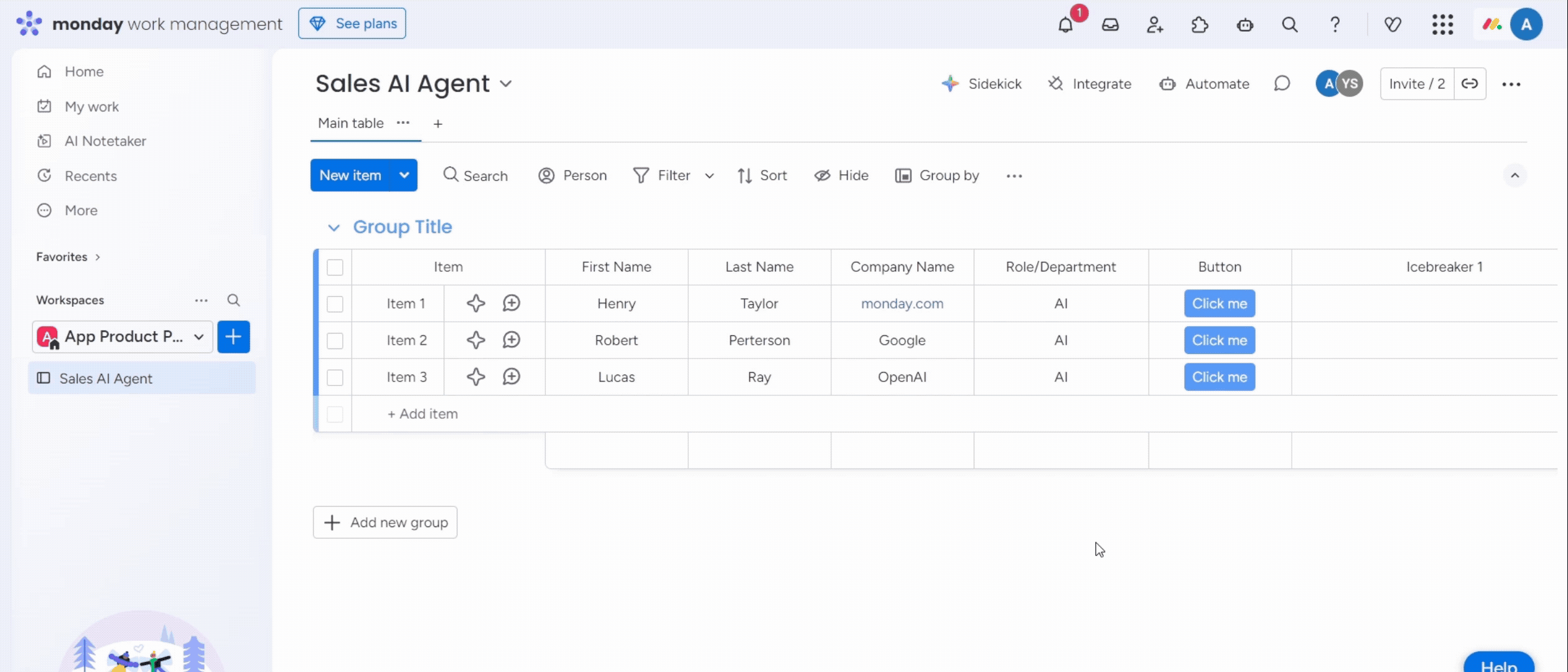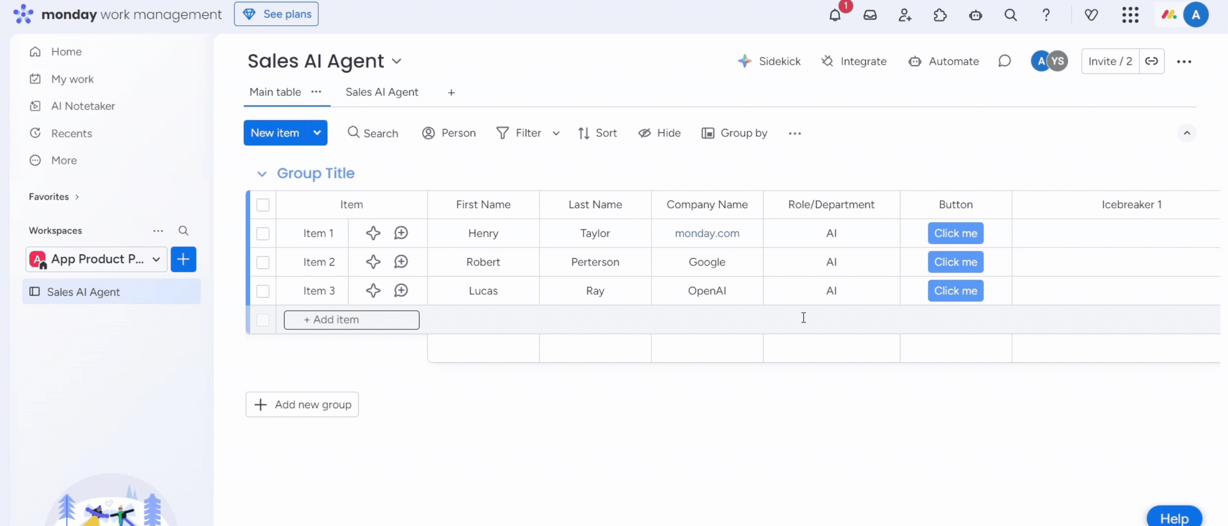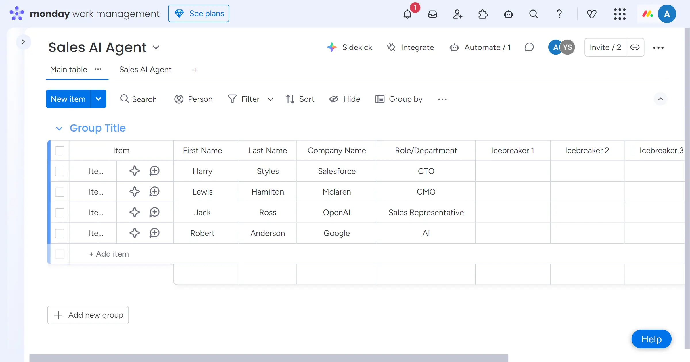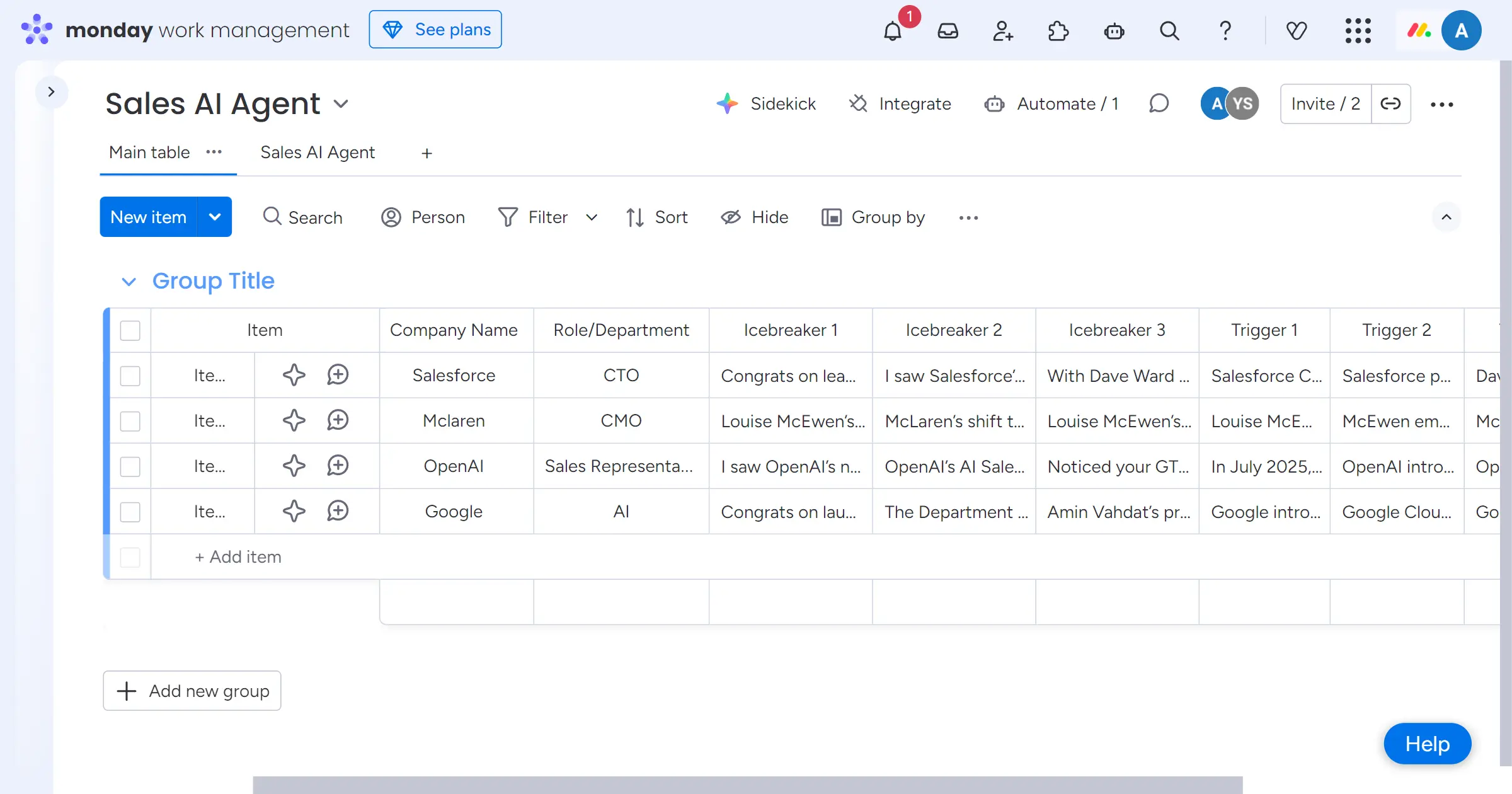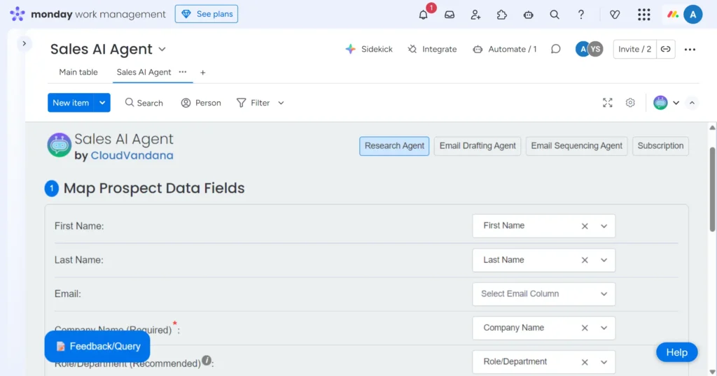 Create or import leads into your monday.com board. The agent uses your items as the source for research, drafting, and sequencing.